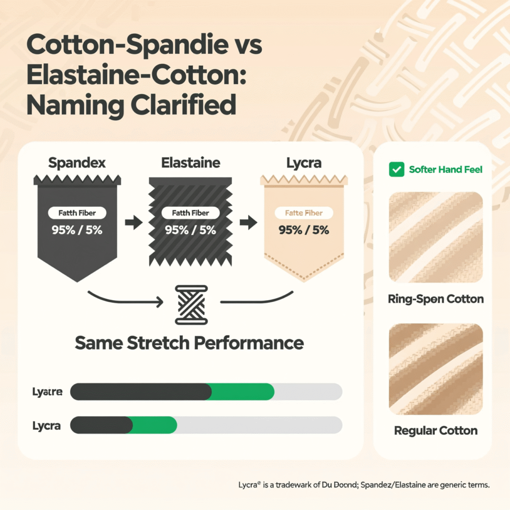 You will see it named in different ways on tags. Some labels say cotton elastane or cotton lycra, and the ratio is the same. Brands choose the term that fits their request.