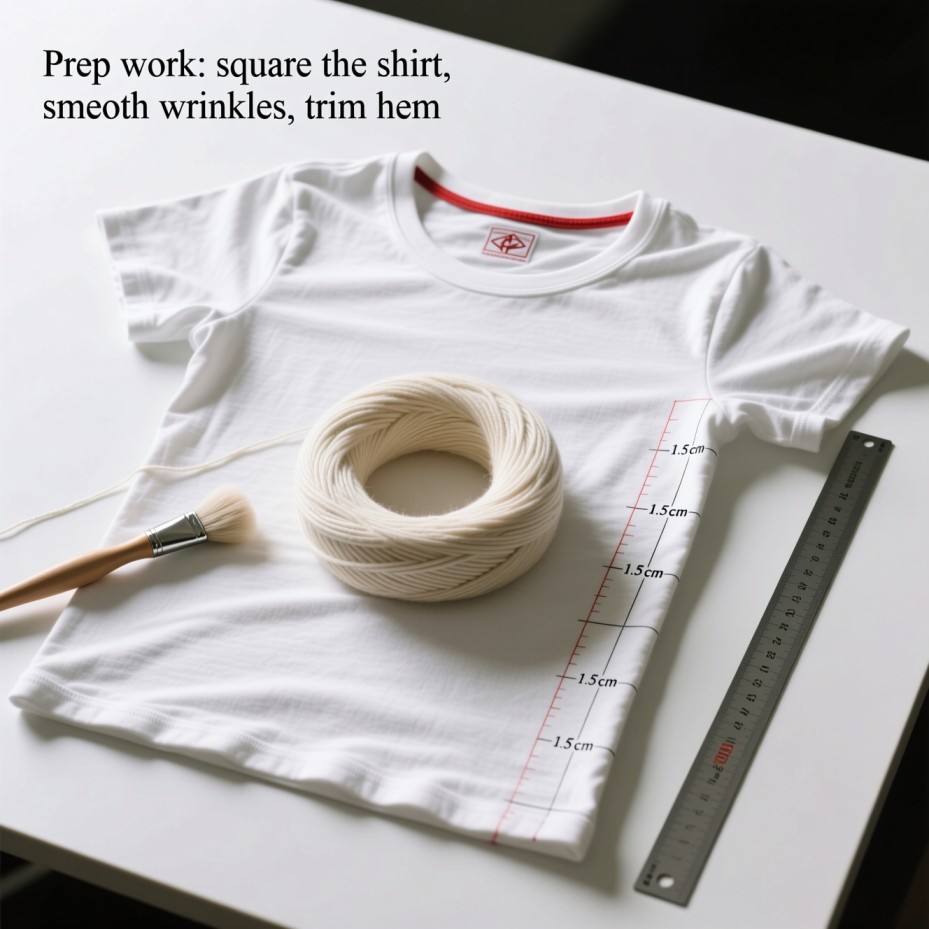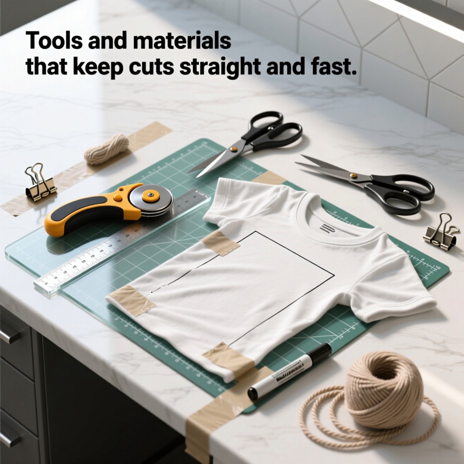 Have clips or painter’s tape to hold edges flat while you square the shirt. Mark widths with a washable pen for an accurate yarn cutting technique. The right setup saves time and preserves your hands for more crafting.
