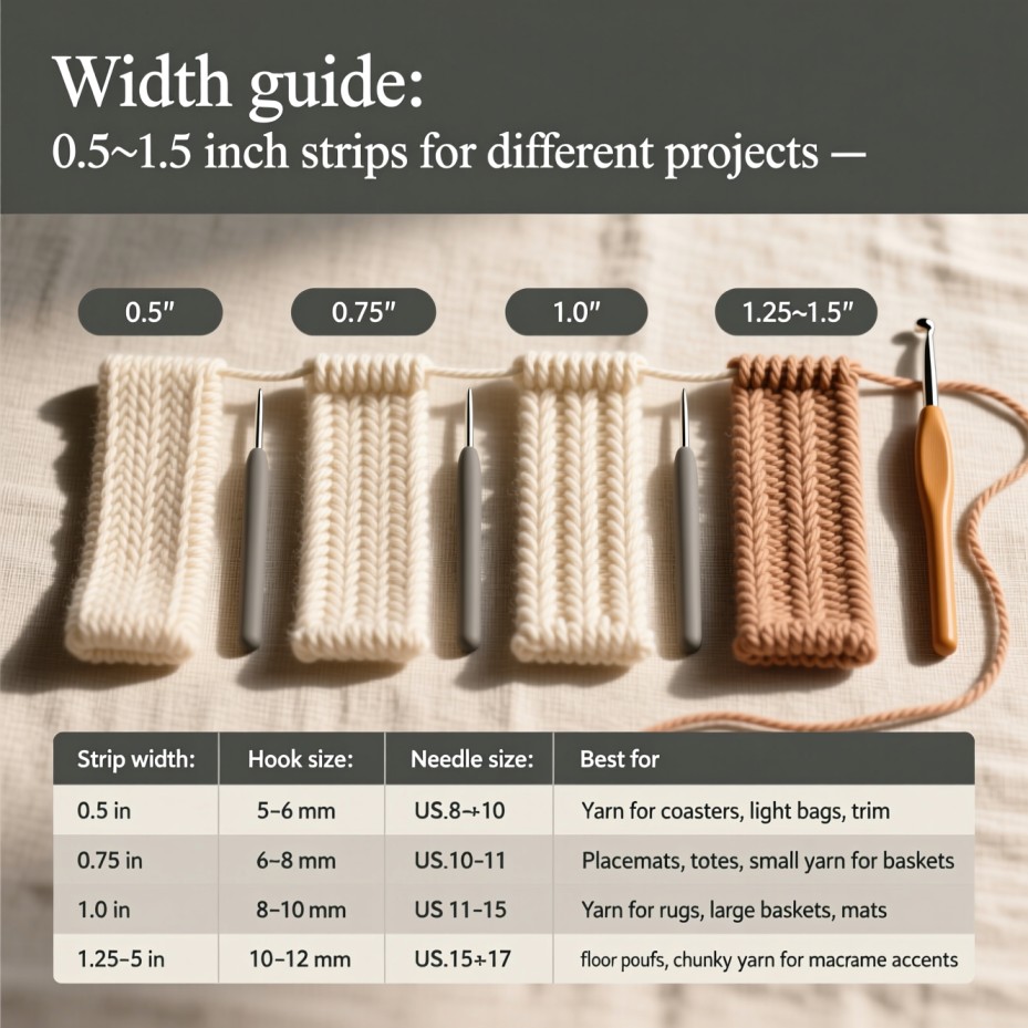 Match strip width to the tool you’ll use. Thin strips suit small hooks and needles, while thick strips excel with big tools and sturdy pieces. This sets up a predictable gauge in crochet projects and knitting projects.