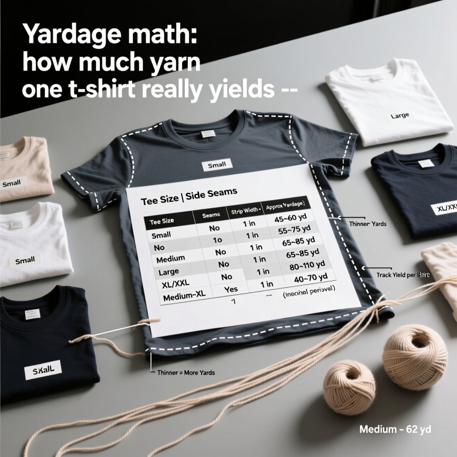 Thicker strips make fewer yards, and thinner strips make more. Track your yarn yield for each shirt type, then store a note with the finished yarn balls. You’ll estimate more accurately on the next run.