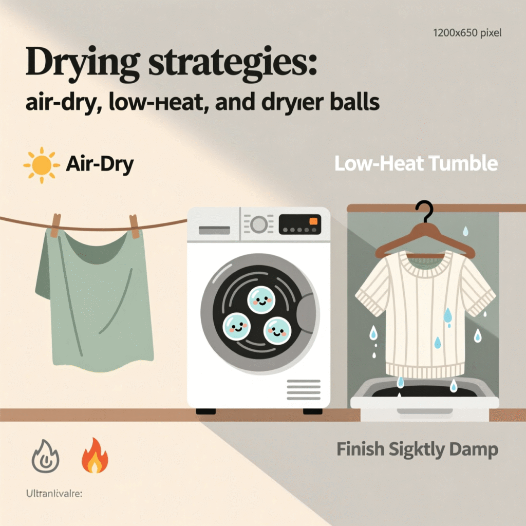 Drying strategies: air-dry, low-heat, and dryer balls