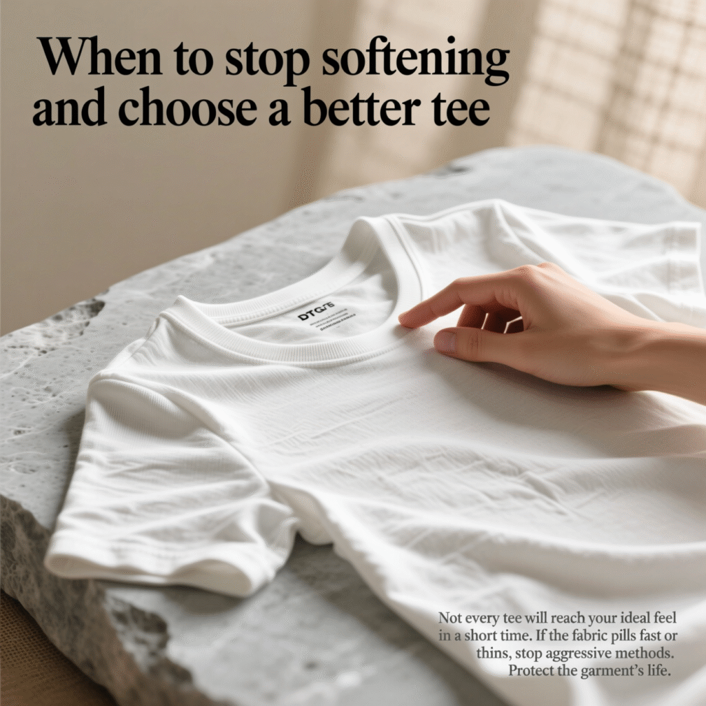 Not every tee will reach your ideal feel in a short time. If the fabric pills fast or thins stop aggressive methods. Protect the garment’s life.