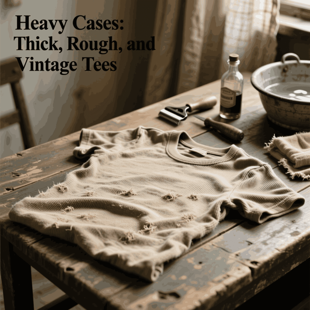 Vintage tees need the gentlest route. Hand wash cool, use a short vinegar rinse, and avoid aggressive abrasion. You’re preserving character and adding comfort.