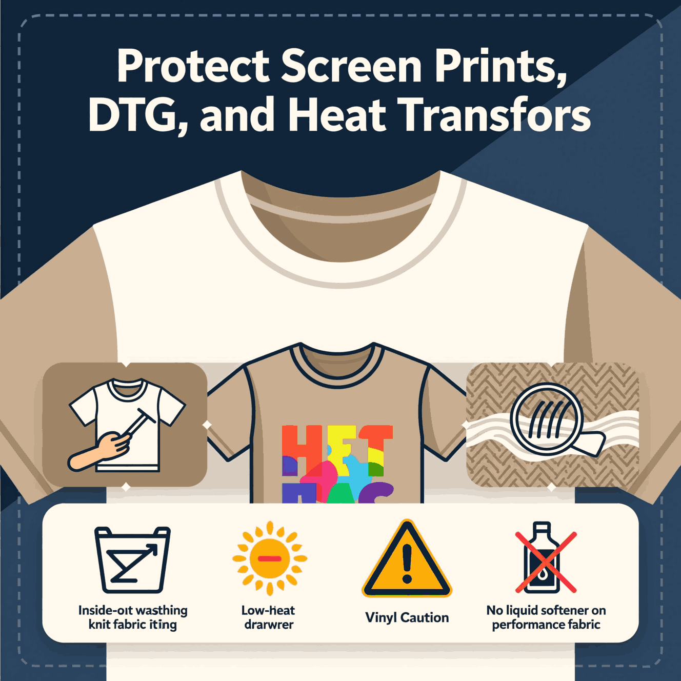 Identify the print. DTG, screen print, and vinyl transfers need gentler handling. Use inside-out washing to reduce surface scuffing and protect edges.