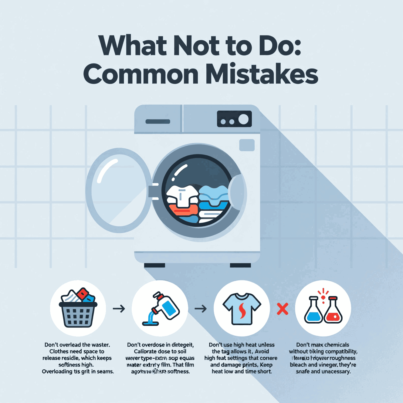 Don’t overdose on detergent. Calibrate detergent dose to soil level and water type because extra soap equals extra film. That film works against softness.