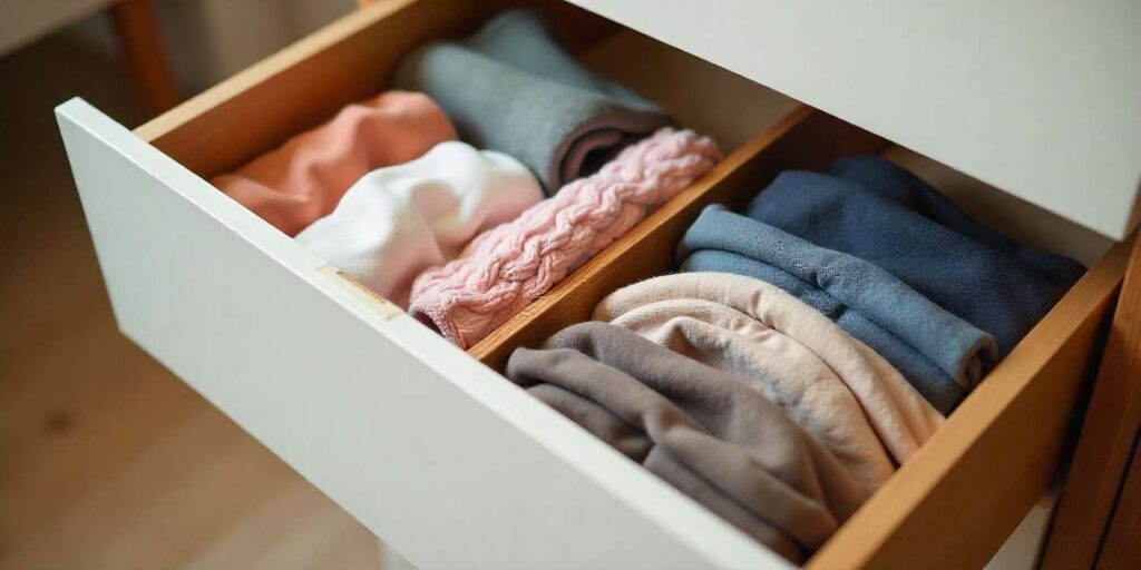 Over‑stuffed drawers grind fibers. Add dividers and reduce stack height. File‑fold to see everything at once.