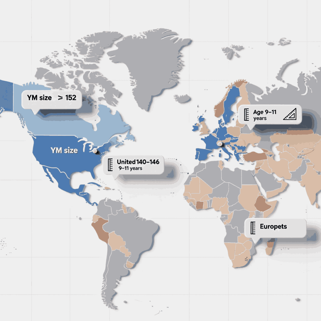 • US YM ≈ EU 140–146 (sometimes 152); UK roughly 9–11 years.