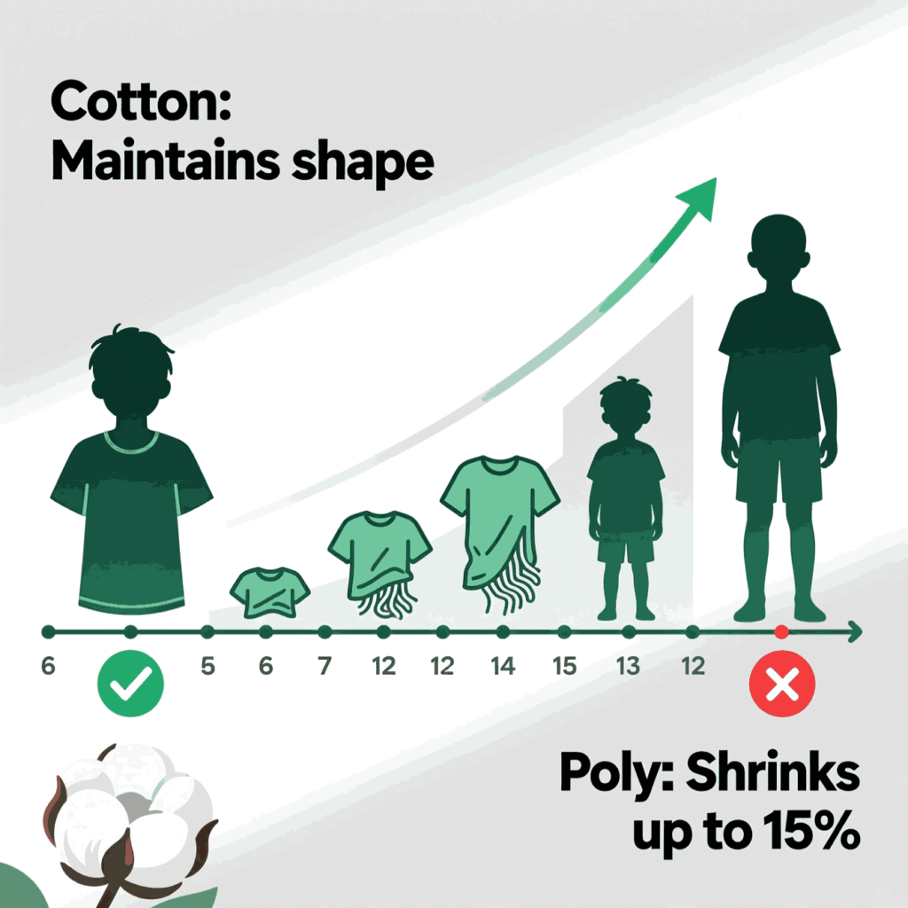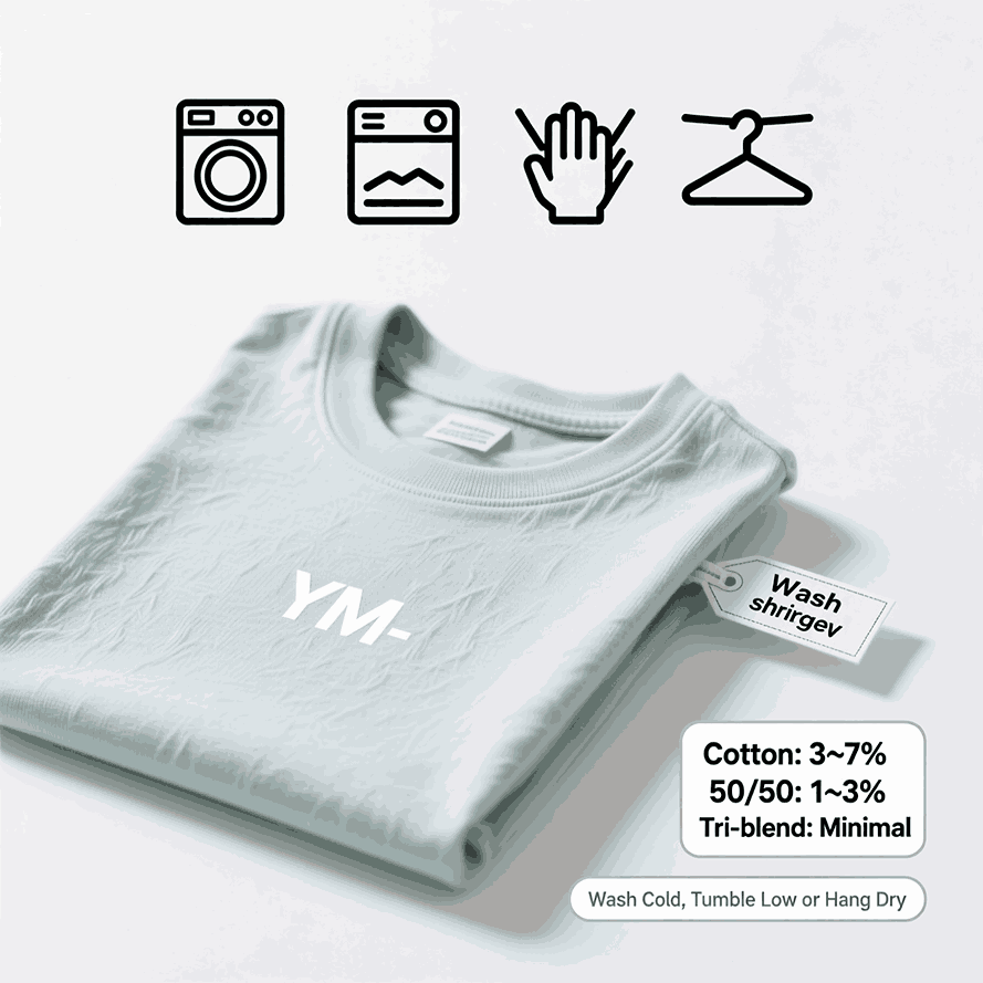 Cotton can shrink 3–7% with heat; 50/50 blends shrink 1–3%; tri-blends least. Care choices directly change fit and length. Keep youth apparel qualityyouth clothing measurementsyouth medium t-shirt dimensions, and youth medium size guide aligned with care.