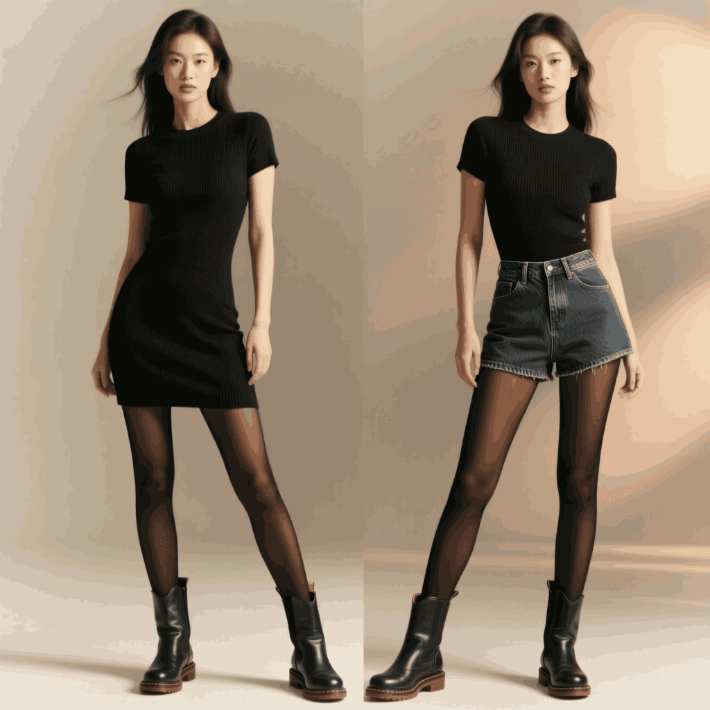 Cold months need slim warmth. Add a wool coat, sleek knee‑high boots, subtle sheer tights, and a leather shoulder bag. Stick to a tight neutral palette.